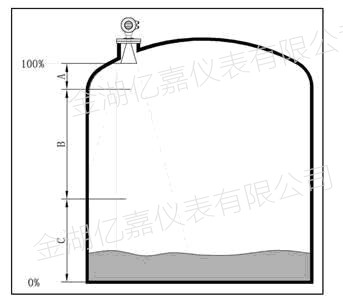 2介質(zhì)為低介電常數(shù)當(dāng)其處于低液位時(shí),罐低可見(jiàn),此時(shí)為保證測(cè)量精度,建議將零點(diǎn)定在低高度為C 的位置。
